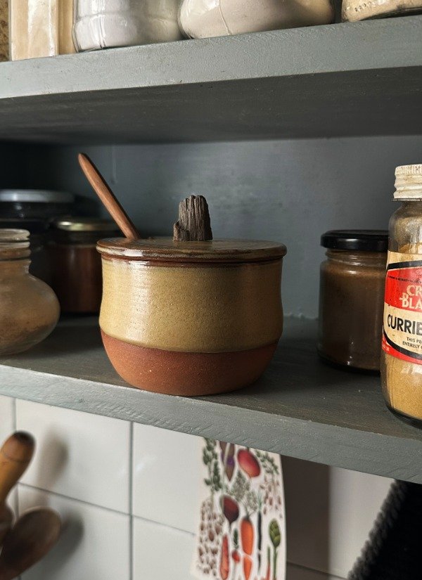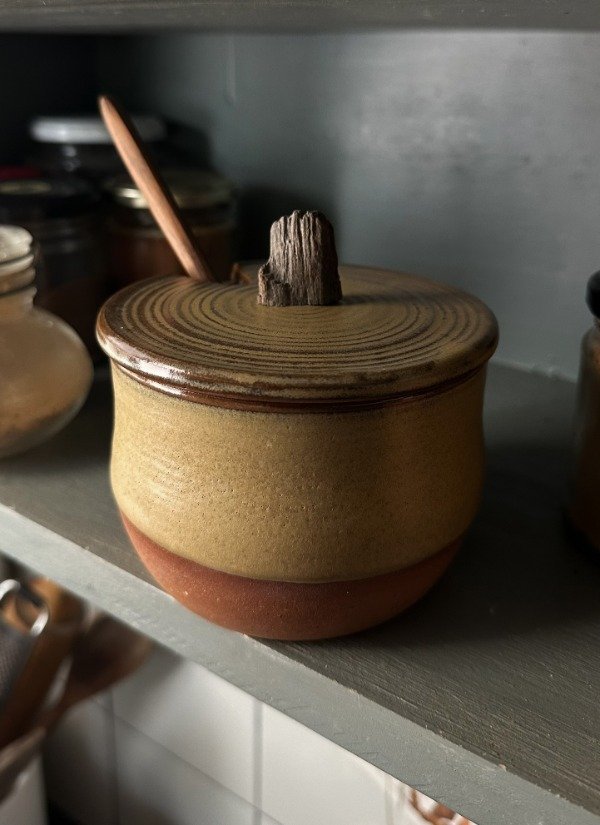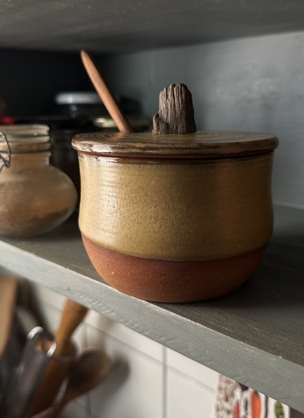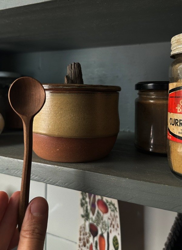 Esta pieza tiene agarre en madera de la Patagonia sujeto con tornillo de bronce :) viene con cucharita de madera hecha por manos locales, curada con cera de abeja.