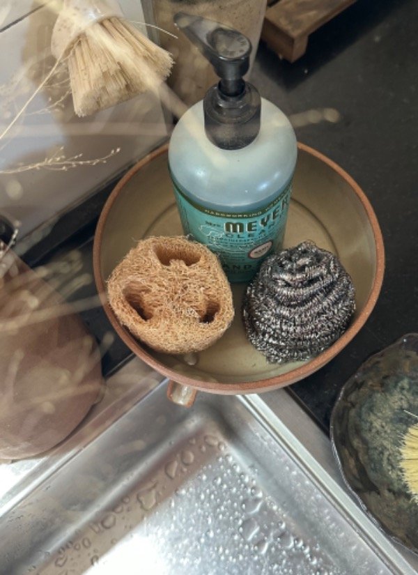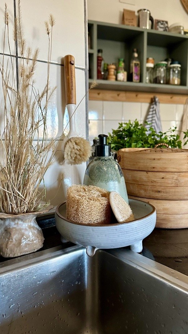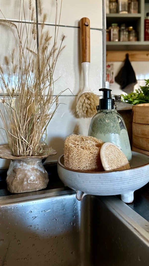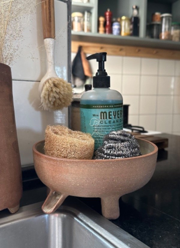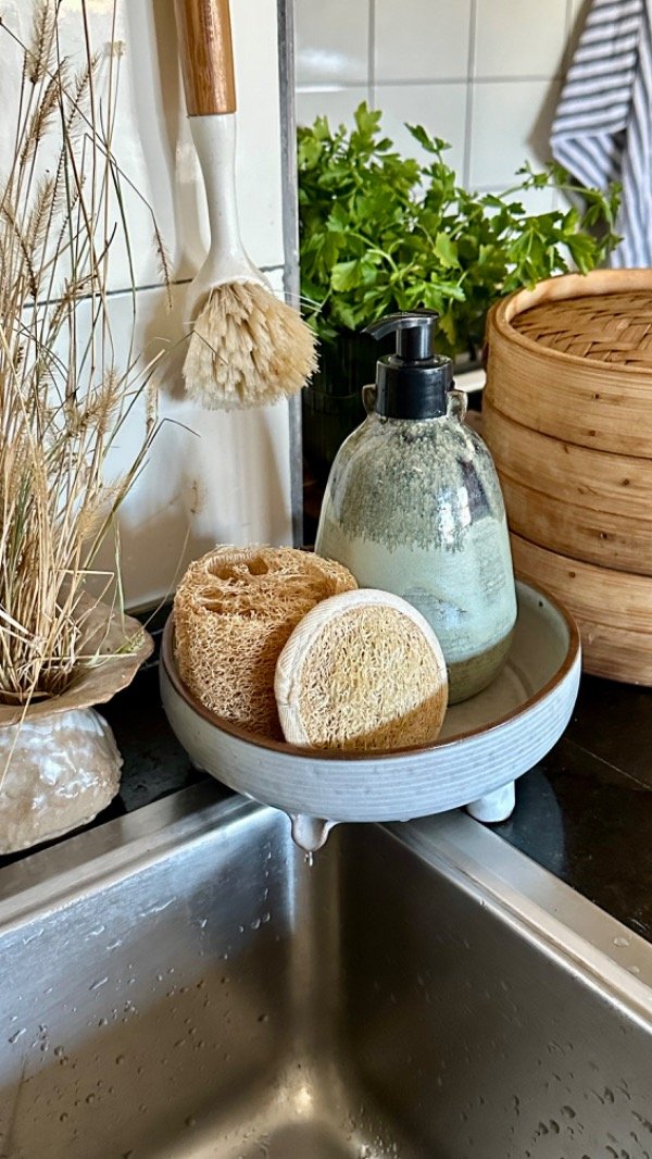 A este cuenco porta esponjas lo que lo hace especial son sus patas que no permiten que se acumule el agua por debajo, y el drenaje lateral diseñado para que no se acumule agua por dentro y desagote directo en la bacha :)