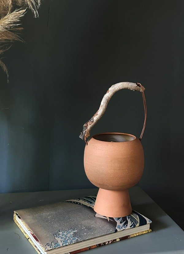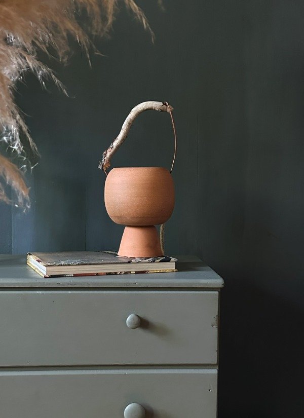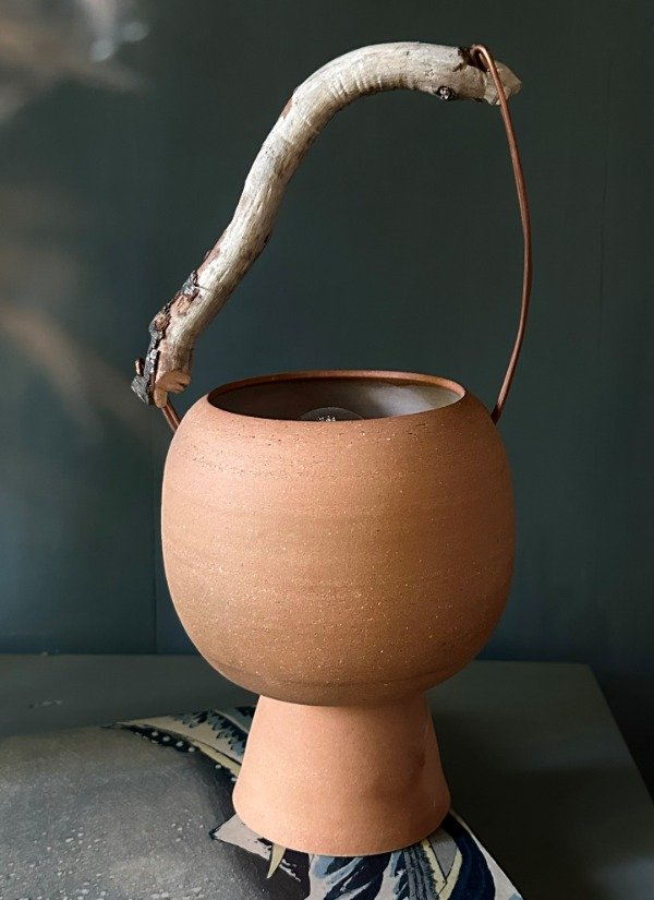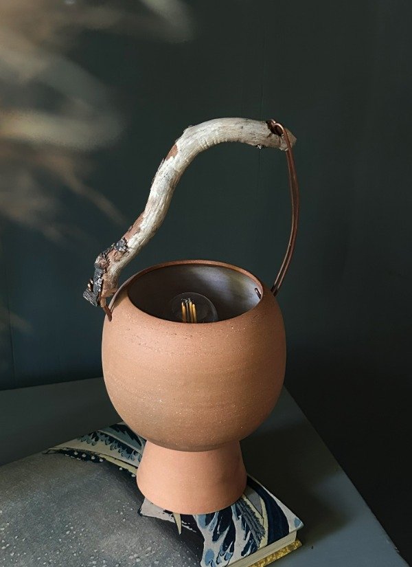 La lámpara LUNA de RIO tiene detalles en alambre de cobre y madera de nuestra Patagonia, portalámparas cerámico y cable textil de yute de 1,5 mts.